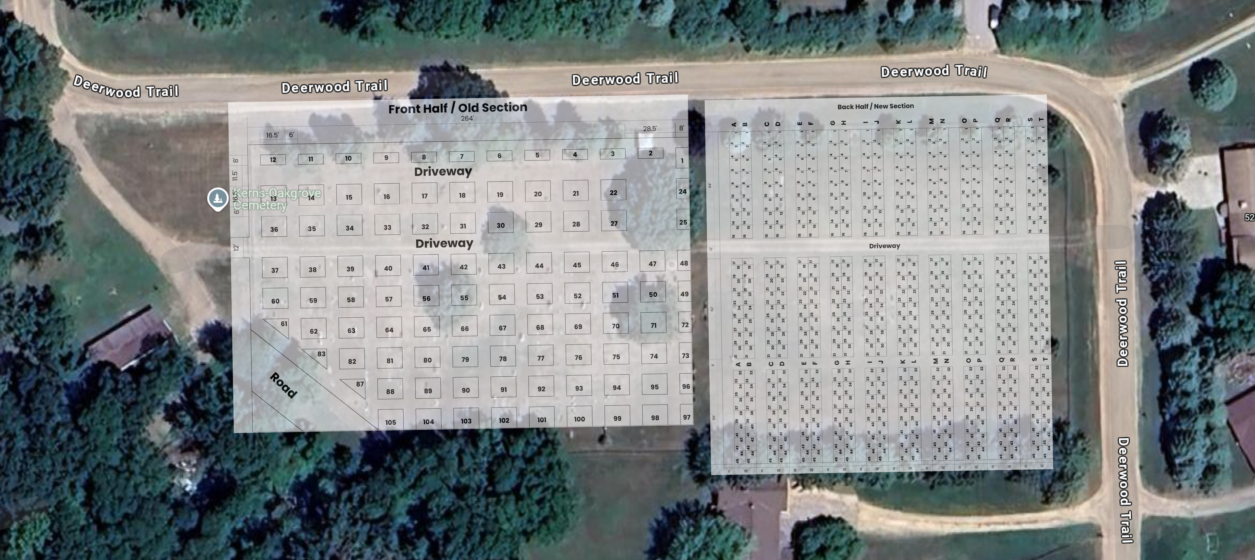 This view shows how the maps align to the cemetery to ease the process of locating a grave. For detailed views of each map, continue below.